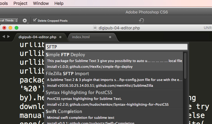 tools > command palette메뉴를 실행하고 install을 입력해서 검색되는 결과 중 ‘install packages’를 실행하면 다시 대화창이 뜨는데 여기가 다양한 플러그인들이 모인 곳이다. 다시 이번엔 ‘SFTP’를 입력해서 제일 상단에 뜨는 플러그인을 설치하자.