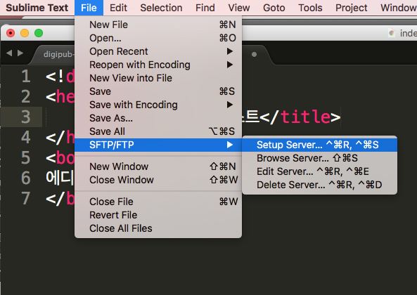 이제 시작할 준비가 되었다. file메뉴에 SFTP가 보이면 성공이다. 이제 ftp프로그램에서와 마찬가지로 호스트, 아이디, 비번만 설정하면 끝이다.