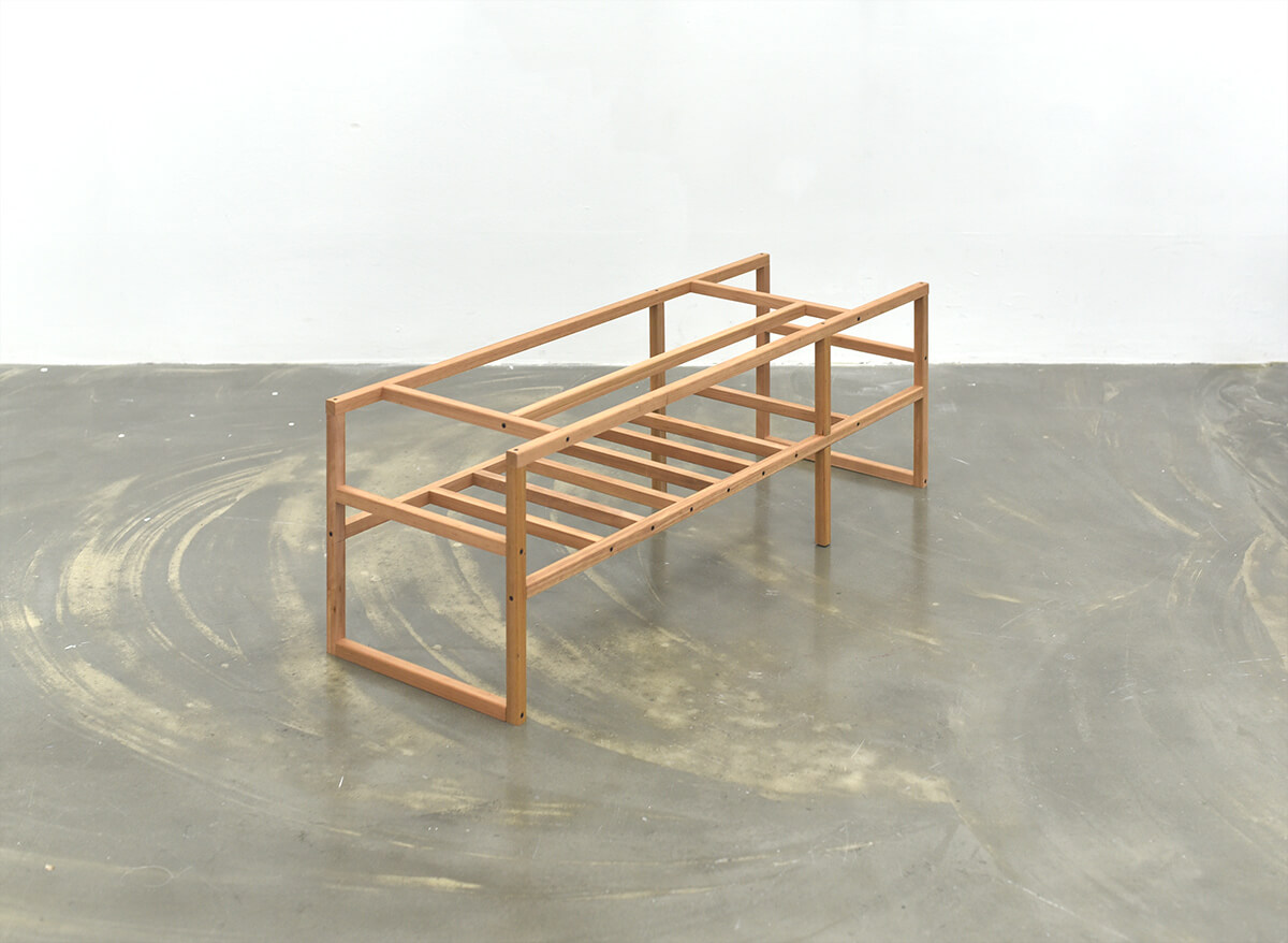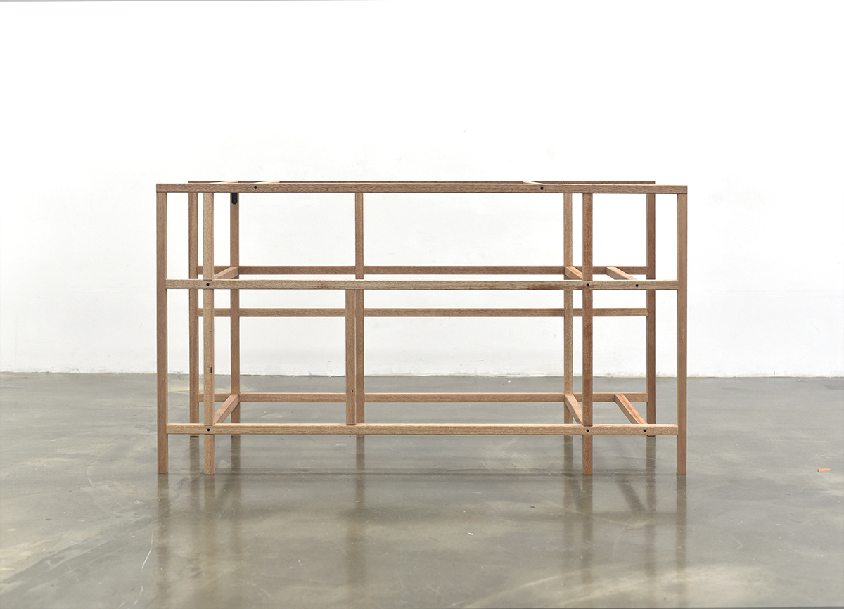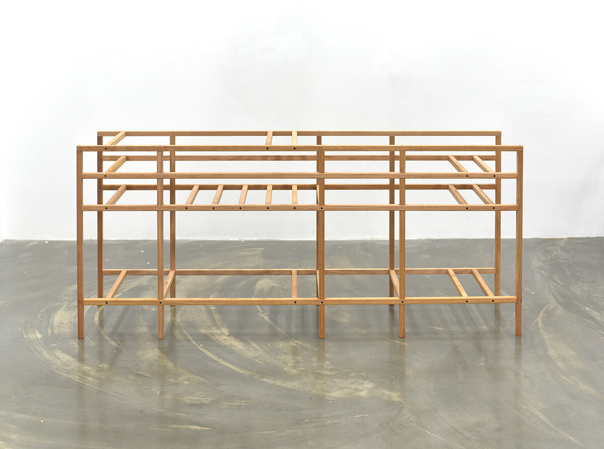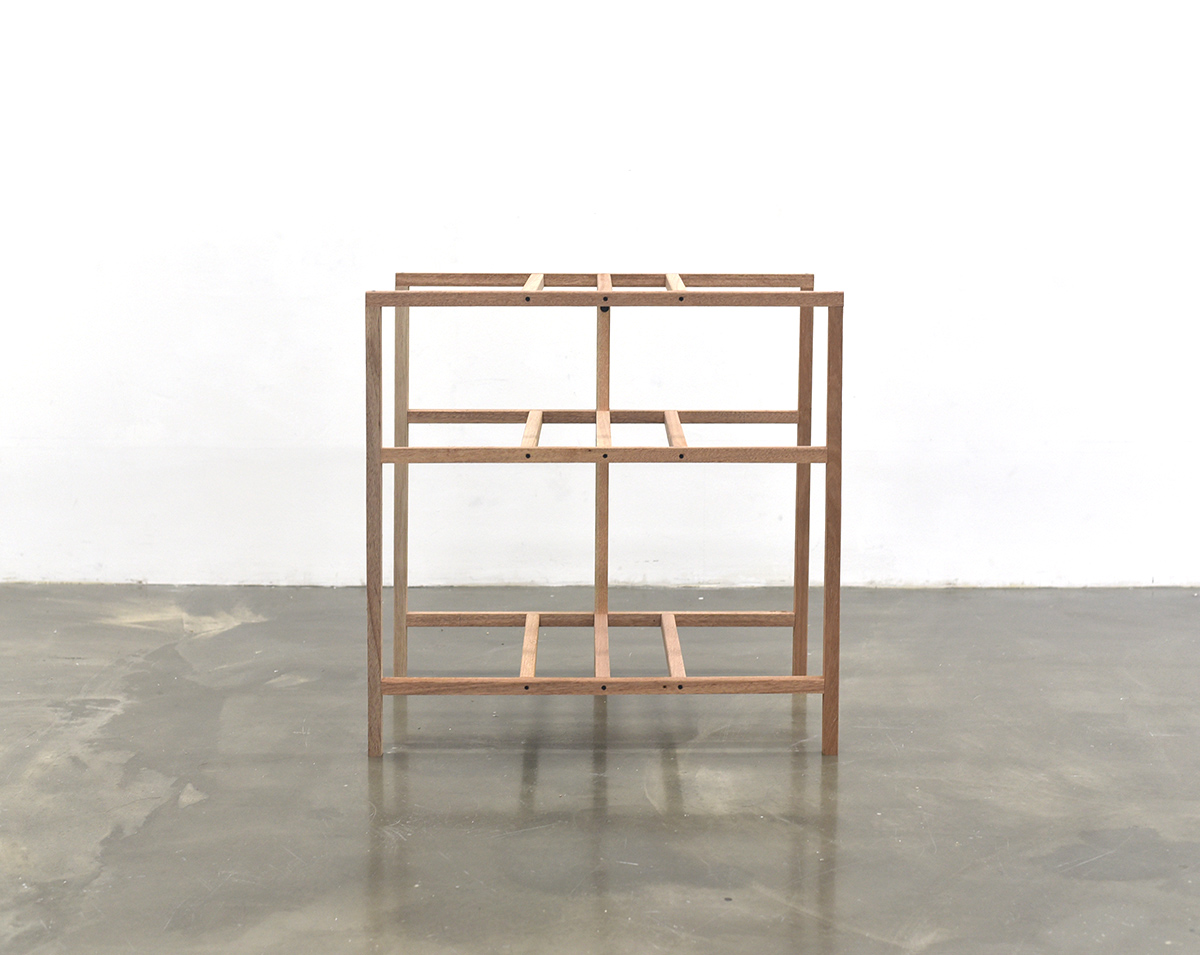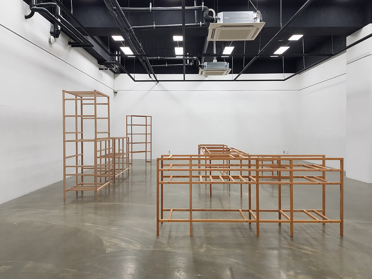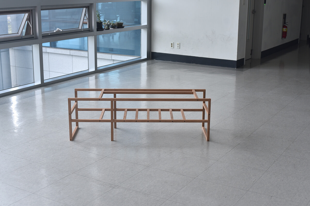 전시가 끝나고 남는 것이 없도록 미리 용도를 정했다. 대부분의 작품들은 상판을 얹는 등 쓰일 수 있도록 적절한 보강을 통해 부모님이 거주하시는 시골집에 놓일 것이다. 도록을 웹으로 만드는 것도 같은 맥락에서다. 이 다용도 선반은 앞서 낮은 이불장과 쌍을 이루어 한쪽 벽을 차지한다.