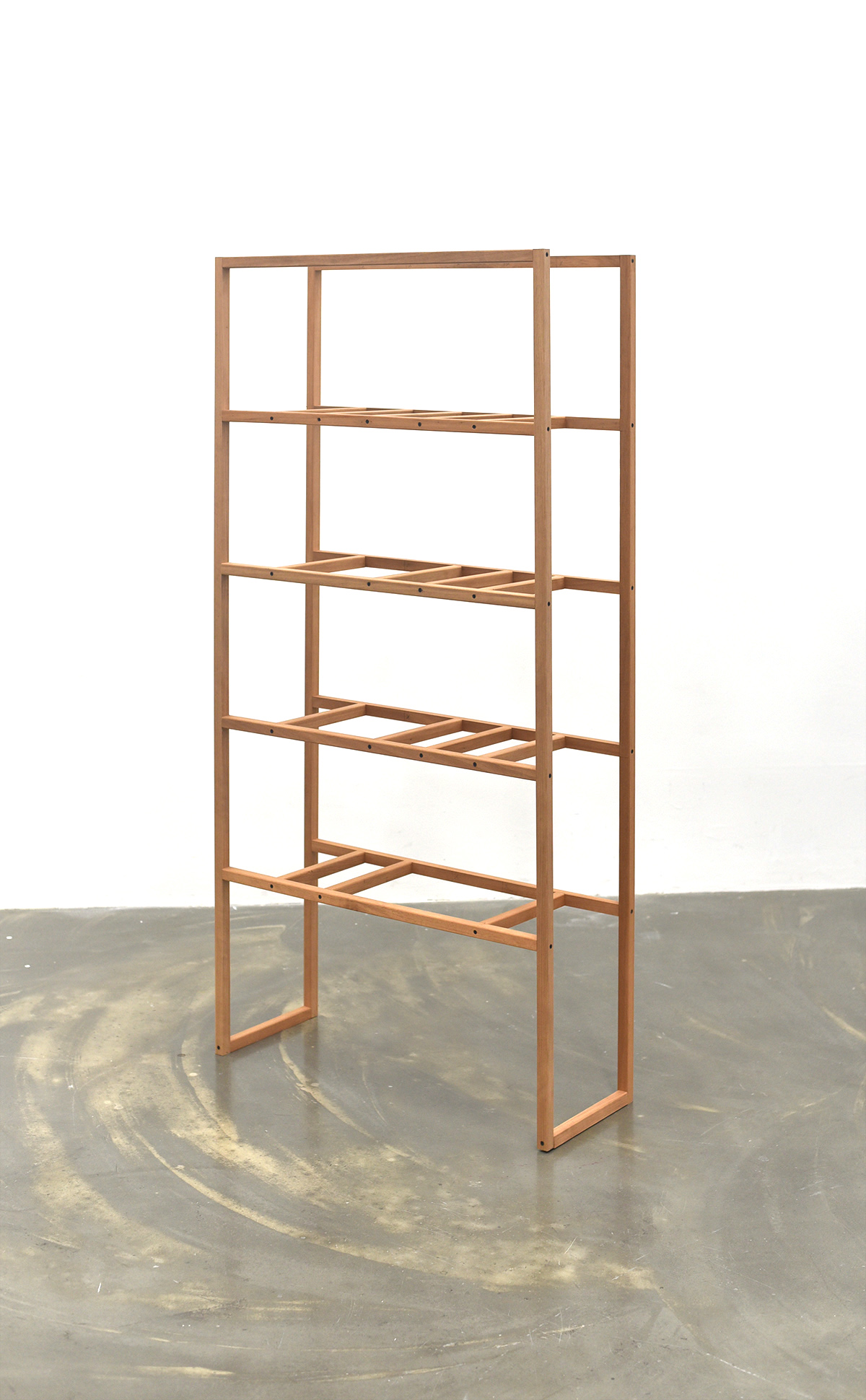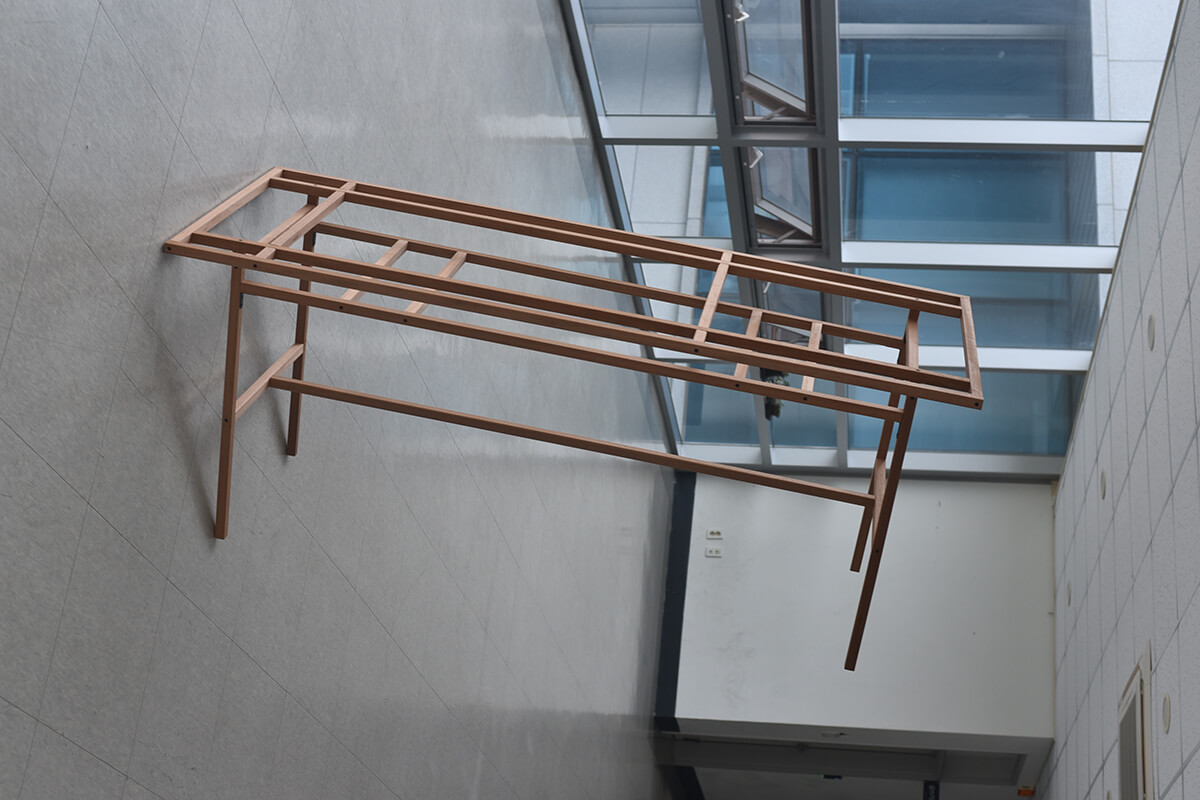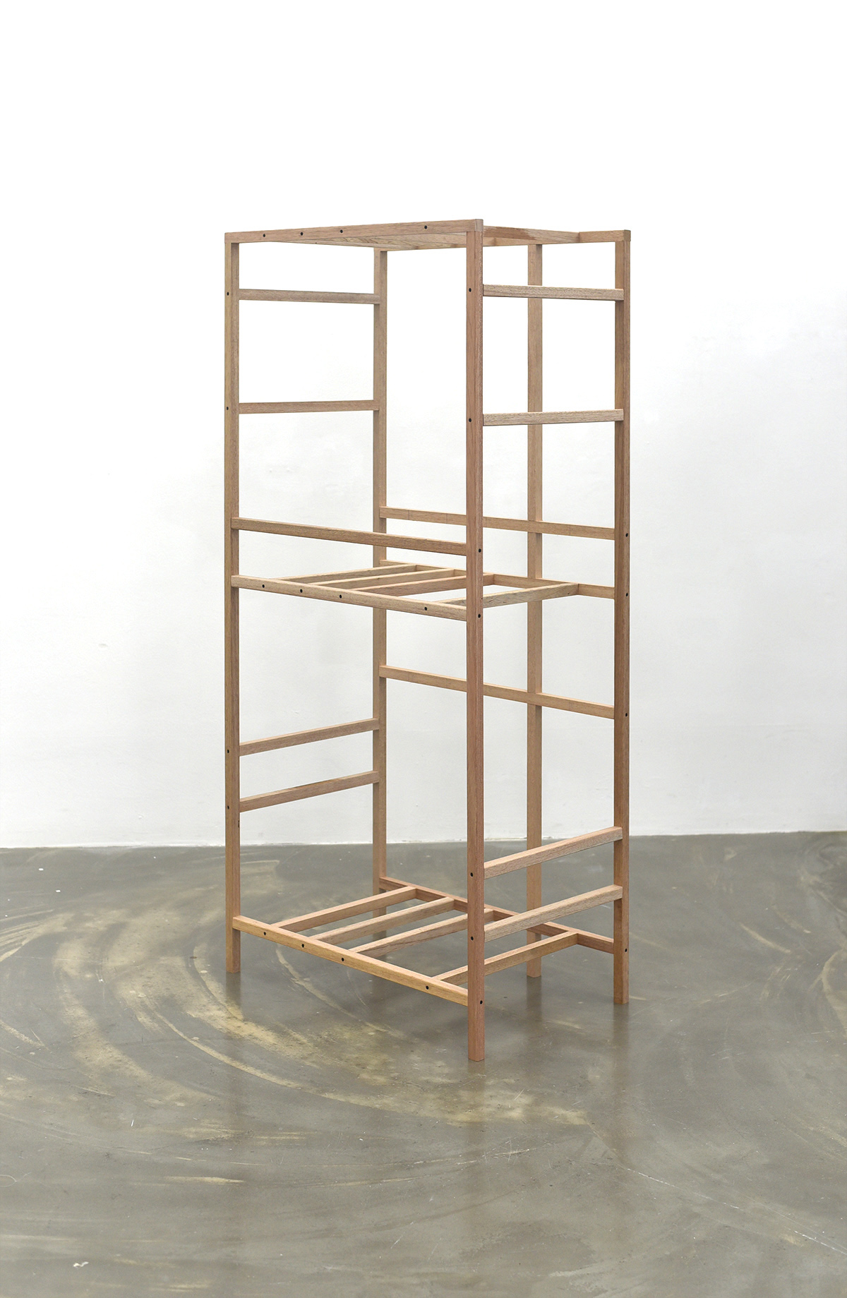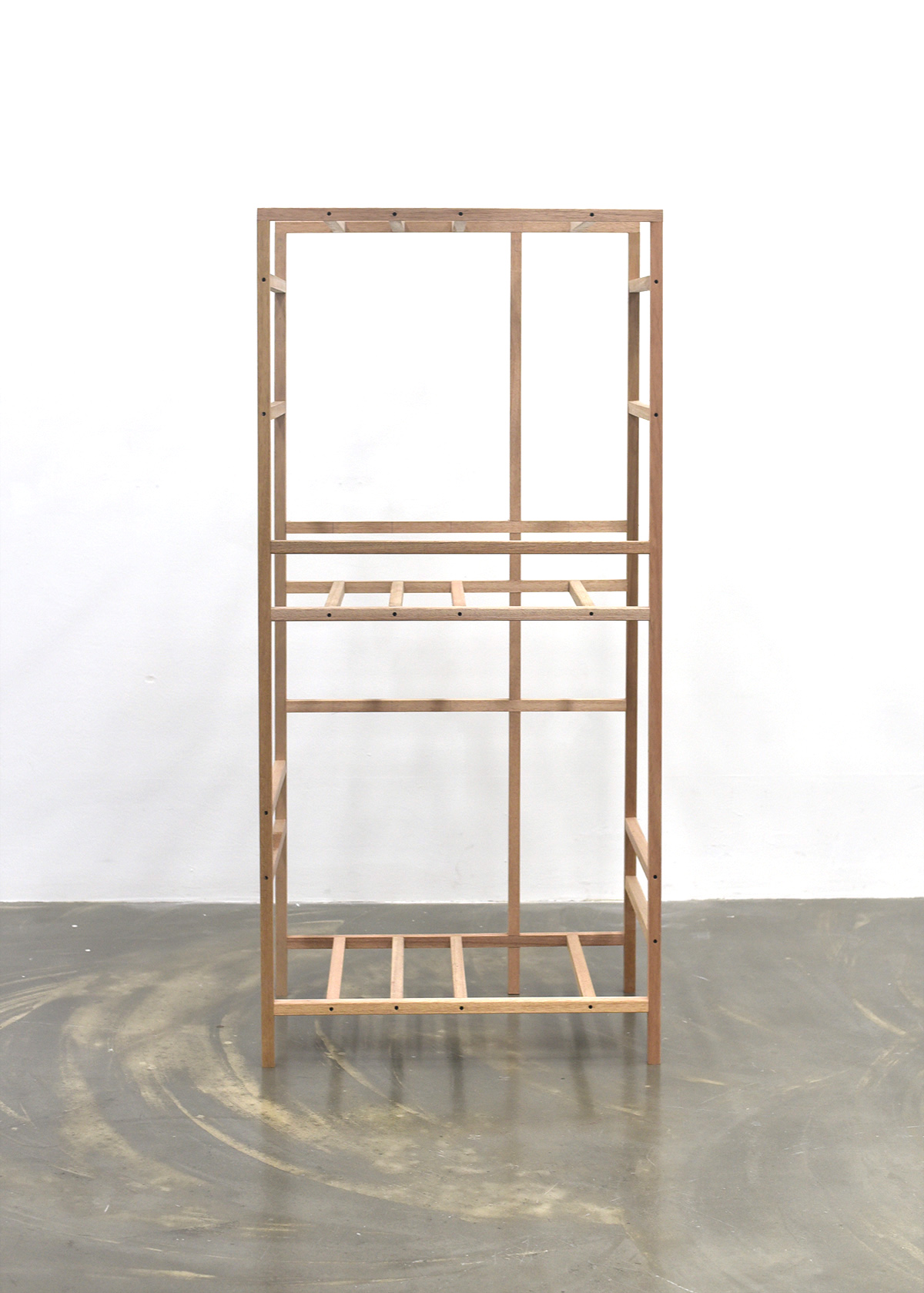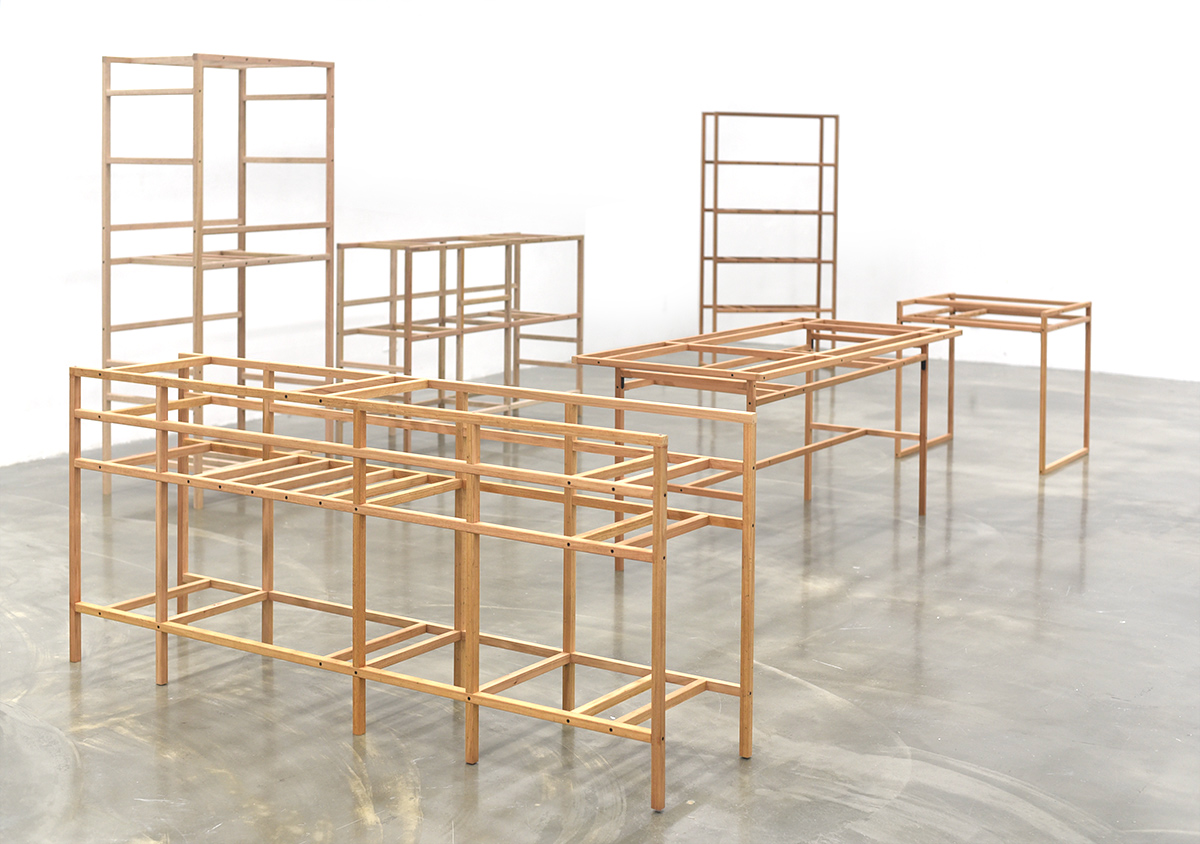 전시가 끝나고 남는 것이 없도록 미리 용도를 정했다. 대부분의 작품들은 상판을 얹는 등 쓰일 수 있도록 적절한 보강을 통해 부모님이 거주하시는 시골집에 놓일 것이다. 도록을 웹으로 만드는 것도 같은 맥락에서다. 이 다용도 선반은 앞서 낮은 이불장과 쌍을 이루어 한쪽 벽을 차지한다.